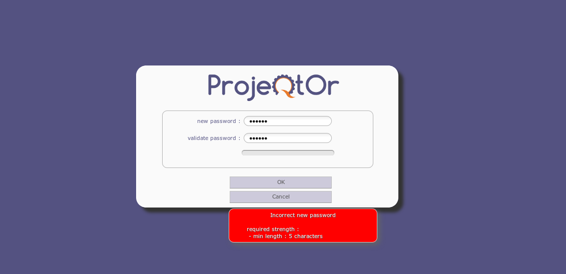 ProjeQtOr free project management software - Incorrect new password required strength : - min length : 5 characters - ProjeQtOr