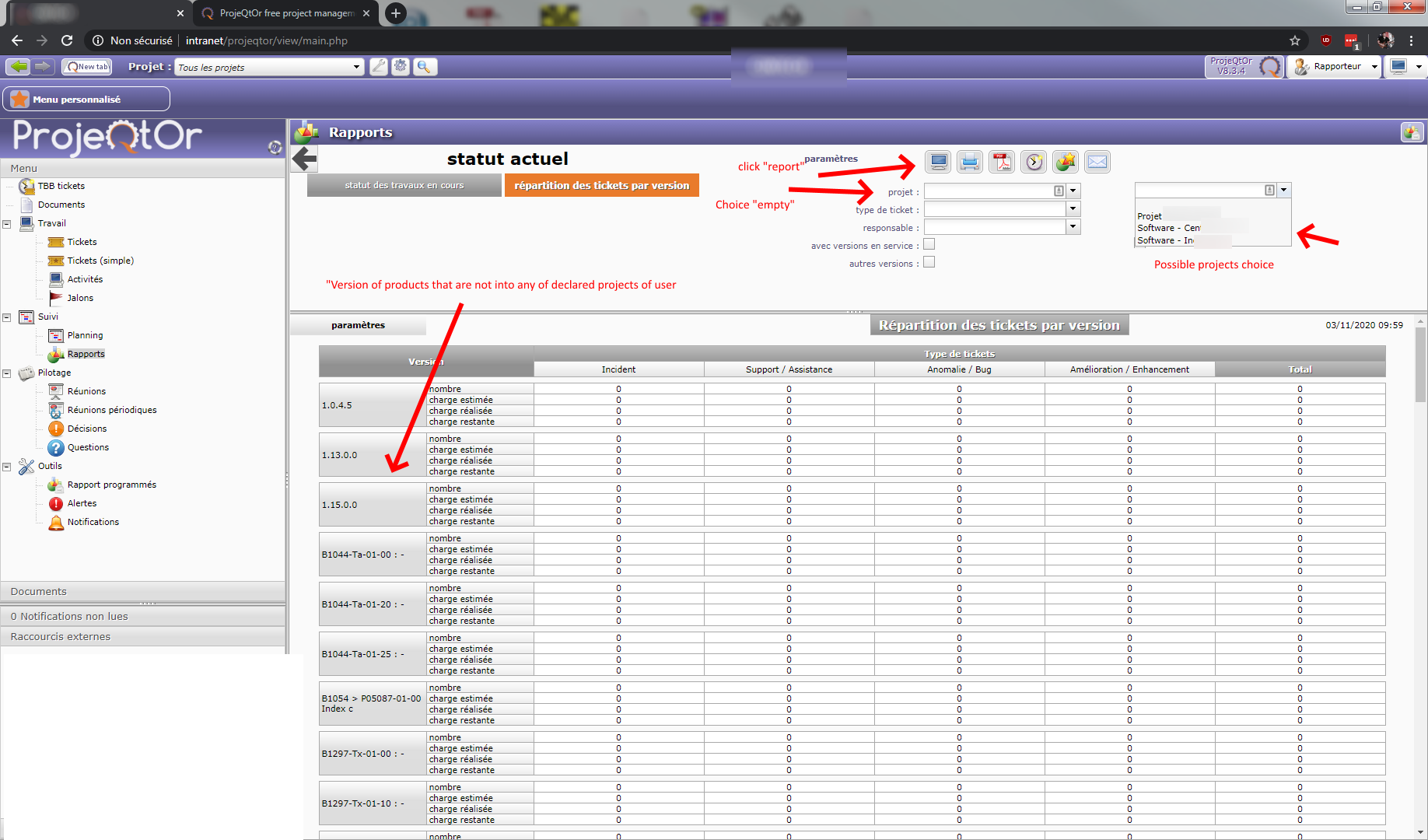 When I log in with this user and I check report > actual status > "ticket by version" I've got the parameters box that appear with project possibilities ok (project defined for this user) / type of ticket (all type of ticket) and responsible with all responsible people of ALL my projects, included those where this user is not affected and that this user should not be able to see !