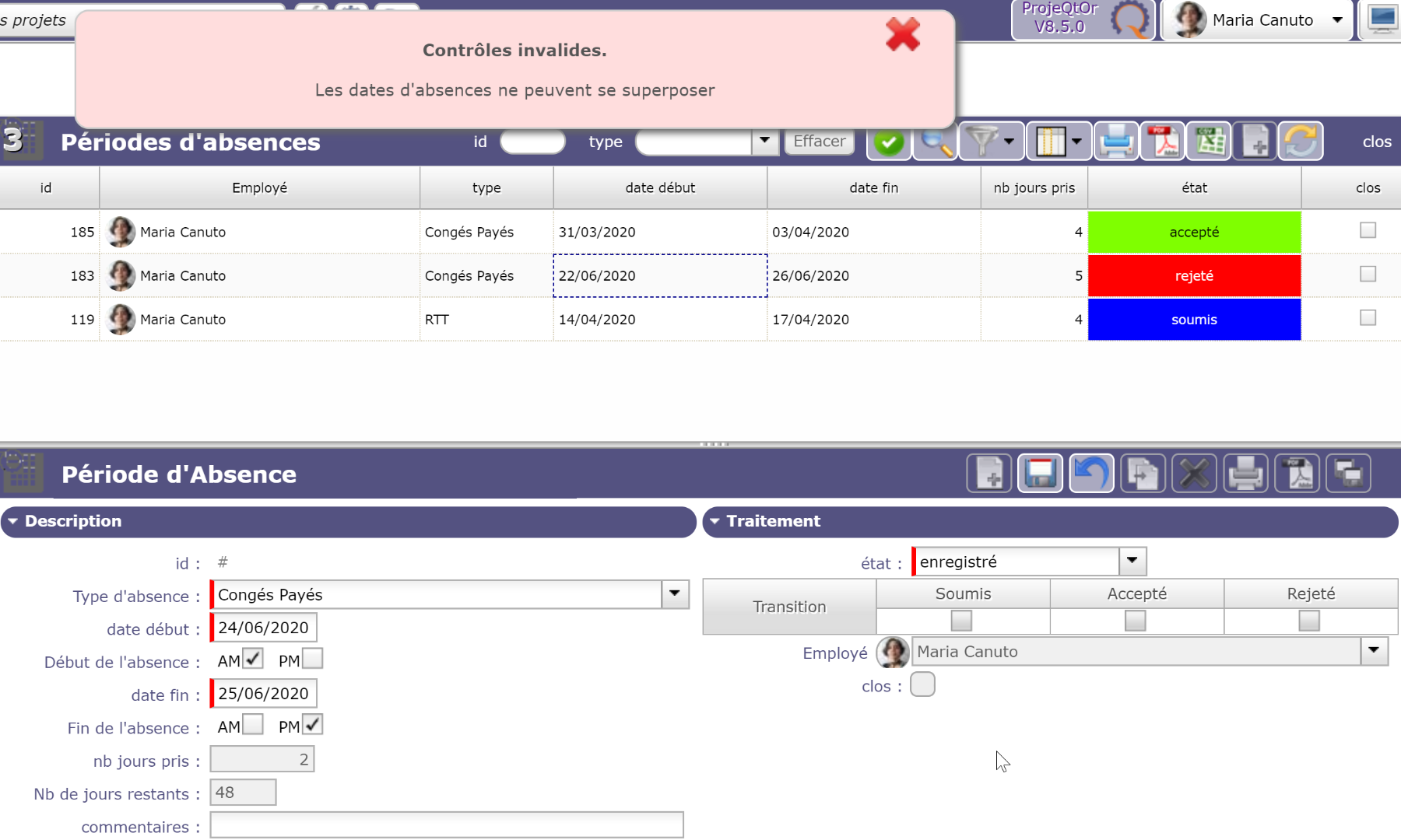 I have a problem when I try to create a leave period over a period rejected, ProjeQtOr doesn't accept it.