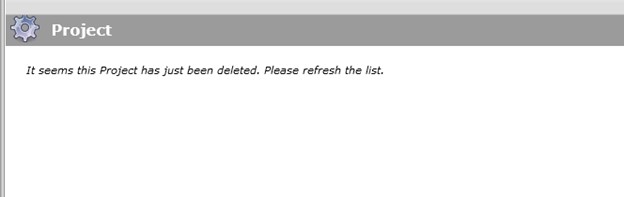 When I tried to copy the project the green notification flashed at the top of the screen like it worked fine and the notification stated that the project was successfully created, with the next (whatever number it flashed) ID (the next project ID). HOWEVER, immediately thereafter, the screen went blank (in the details space) and did not go back to the normal details screen, but showed only a notification that said "It seems this project has just been deleted. Please refresh the list." I've attached a screen print of what the notification was -- EACH time.I tried to copy the project again -- multiple times -- and each time it showed the same success notification, with the same deletion error. I then changed the project type to Template thinking perhaps that would fix it. It didn't. I probably tried to copy the project with multiple settings, etc. 6 to 10 times. I always received the same error.