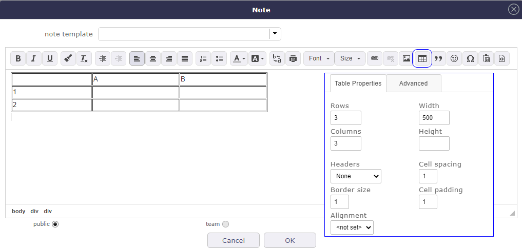 Indeed, copying / pasting an already formatted table gives more or less faithful results. But being able to create a table with borders directly in the editor would be faster.Hint : easy way to include a "formated" table, is to draw it in word, then copy / paste into the note