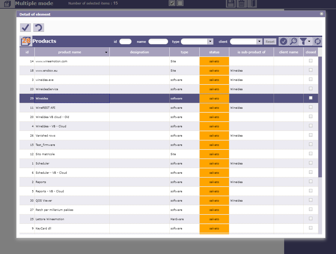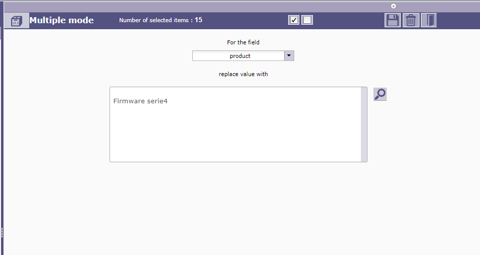3) I select the "Multiple updates" icon, then I select the 15 "product versions" to which I want to modify the Product. This screen is probably abnormal, because in the listbox I only see one product but I have many