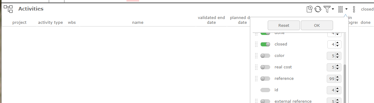 I 've just updated my projeqtor website from 9.0.5 to the 9.1.1 version. After that i was going back to the site with my manager account (not the administrator one). When trying to look at the new features coming whith the 9.1.0 version, I clicked on the head list of the "activities" tool, trying to move columns and so on. The all my activities disapeared from the list of activities. They are still there but not visible in the activity page. I Can see then when choosing "Global view" tool or if i go to the site with my administrator account. It's just on my account that the liste is empty.