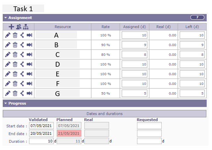Just want to check if the cases mentioned in previous post are normal or there are bugs/setting issues in the calculation. I tried to repeat a case mentioned and attached the screenshots for your reference. The task validated start date is 2021/5/7 and end date is 2021/5/20 with planning mode as soon as possible. In the assigned resources, a few have work allocated on 2021/5/21 instead, while they have capacity on 2021/5/7 such that the work can be distributed within 2021/5/7 and 2021/5/20. In the plan calculation, the planning calculation option - "Plan with overuse (infinite overbooking capacity)" is selected. Is there any issue in the calculation or settings required?