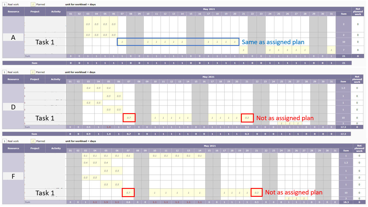 Many thanks for your explanation on the calculation. I think the situation you mentioned does explain for some of the cases, while for the case mentioned in previous post, for resource D and F, all the tasks assigned to them are shown in the screenshot. For resource D, all the task shown in the screenshot belongs to the same project. For resource F, except the first row, other tasks shown in the screenshot are the same project as resource D. If accordingly to your explanation, day May 7 should be able to plan workload = 1 day such that the workload would be allocated through till May20 instead of May 21, right? Please advise there is any misunderstanding. Thanks!