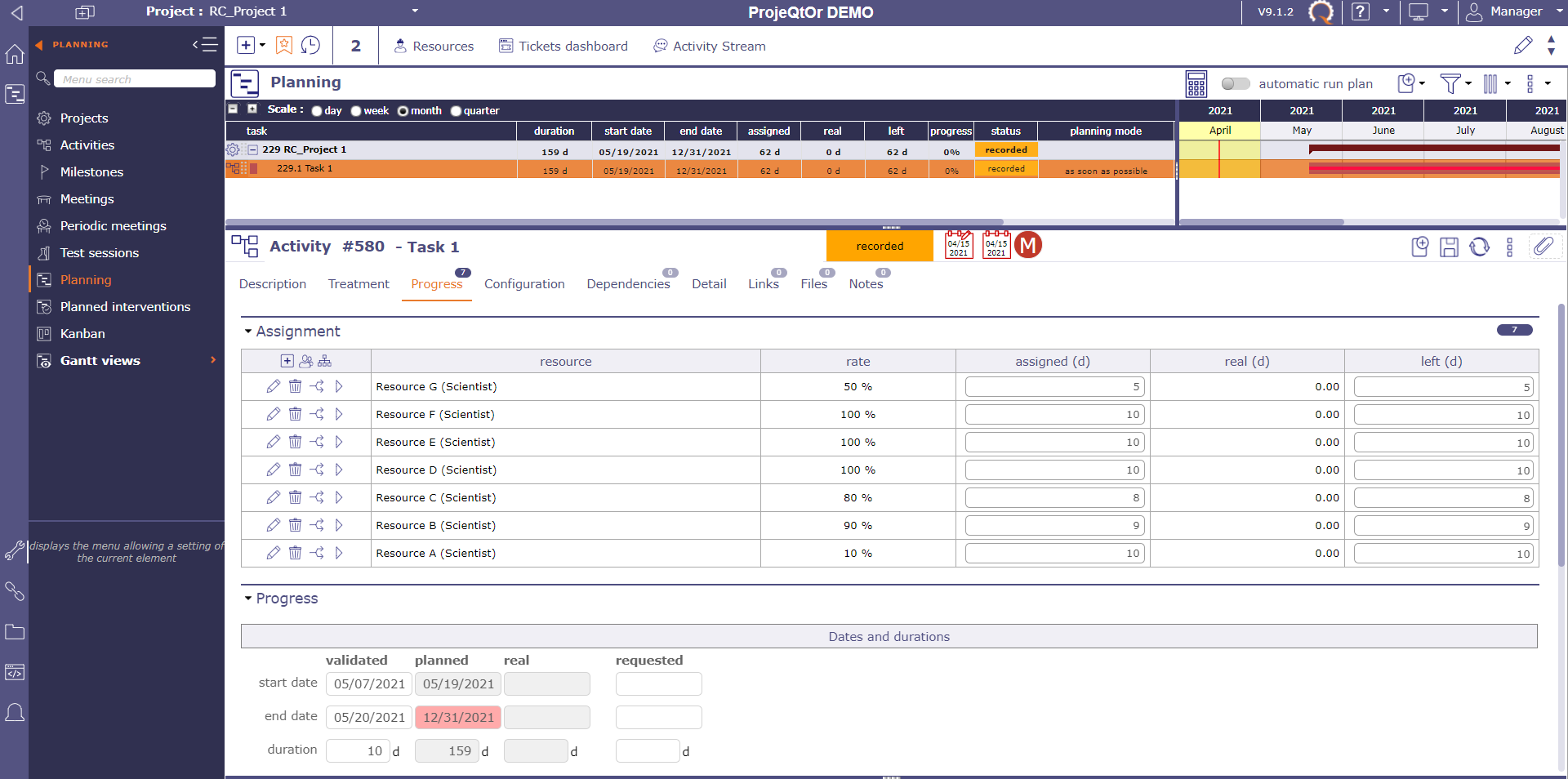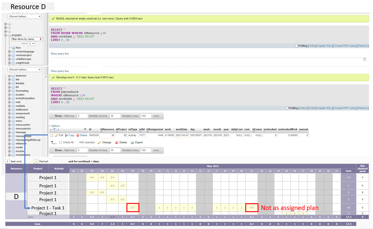 I inputted the task and the resource info for the task mentioned as activity #580, validated start date = '2021-05-07' and validated end date = '2021-05-20'. However, I tried to run the calculation but the planned start date couldn't be planned on '2021-05-07'.