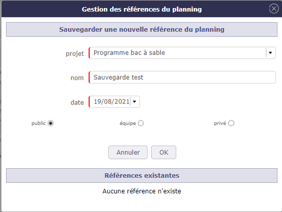 J'ai un problème avec la sauvegarde des plannings. Quand je sauvegarde un planning, je ne parviens pas à le retrouver pour l'afficher. Et quand je réouvre la fenêtre de sauvegarde, il n'apparaît pas dans la liste des "références existantes".