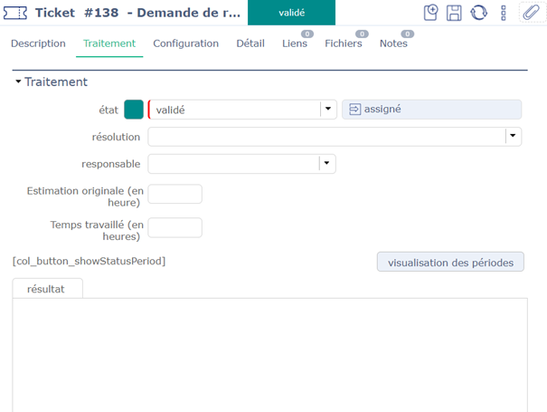 We have made some changes on the ticket screen. In particular, for the « traitement » tab.There is as bug with the display. The label « [col_button_showStatusPeriod] » is displayed with « visualisation des périodes » button (see ticket_display.png). However these fields are hidden using the plug-in (the right part display seems correct), see plug-in_display.png.