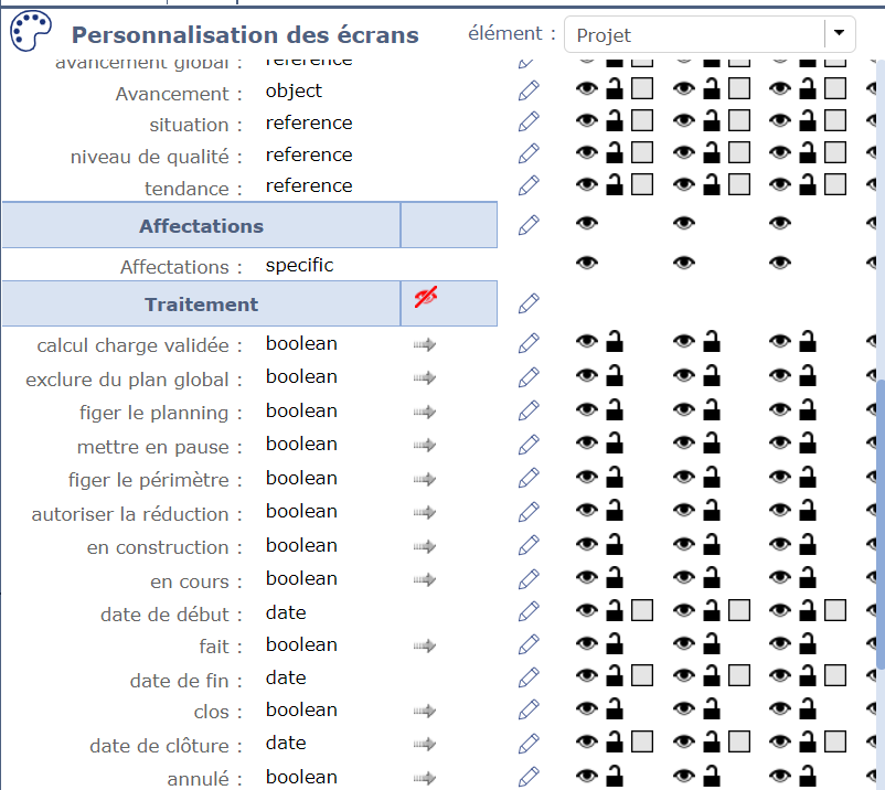 Second, in the plug-in screen for project. We cannot move some fields (for example « en construction ») to other part of the screen.The field « placer après le champ » (place after the field) cannot be selected. (see edit_file).It seems that it is fields from the Traitement block (see block).