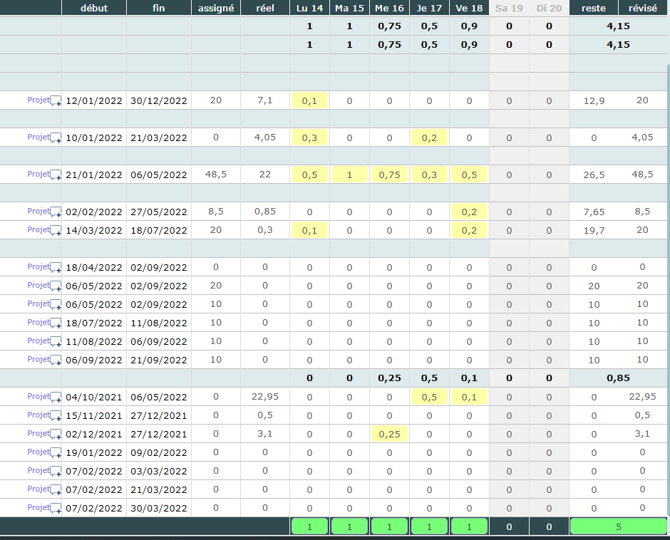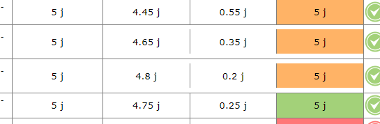 We have noticed, that it is when the imputations are detailled below 1/4 of day. For instance 4.75+0.25 is green and 4.8+0.2 is orange.