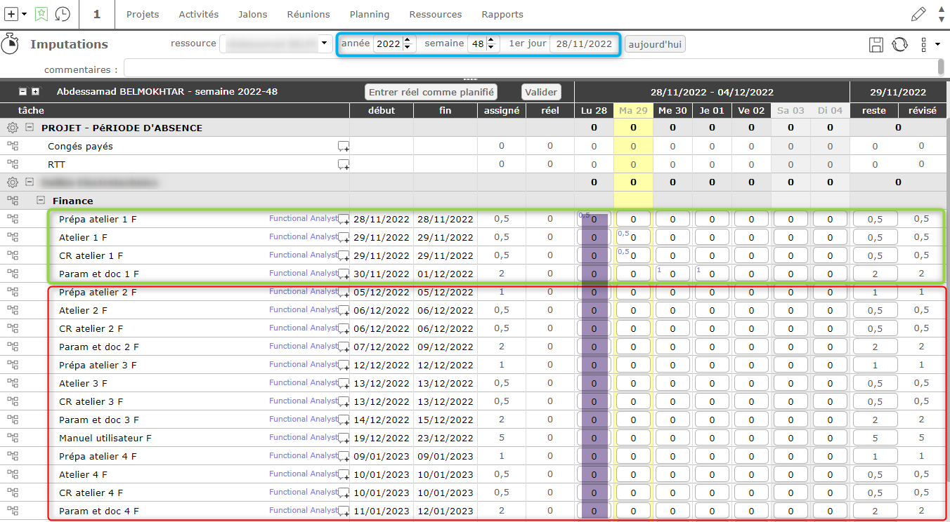 In the screenshot of the timesheet, in blue the entered criteria, in green the activity lines that normally we should see and in red the activity lines that should not be displayed because they do not correspond to the selected week.