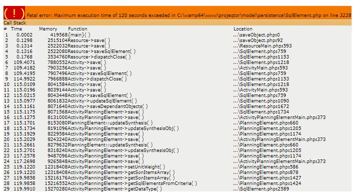 Il need to close a ressource actually associated to more than 160 activites, so ProjeQtor need to close it at the same time. Unfortunatelly it doesn't apparently due to a kind of timeout. Please find attached the error message.