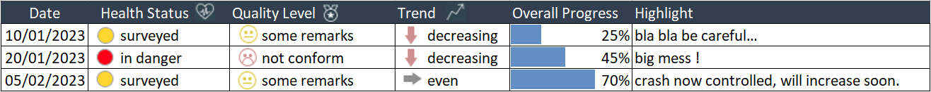 I like to have the health history for a project. A report may still exist (but not found), but is there a way, for a project to have a matrix that displays informations on a planning, something like this :