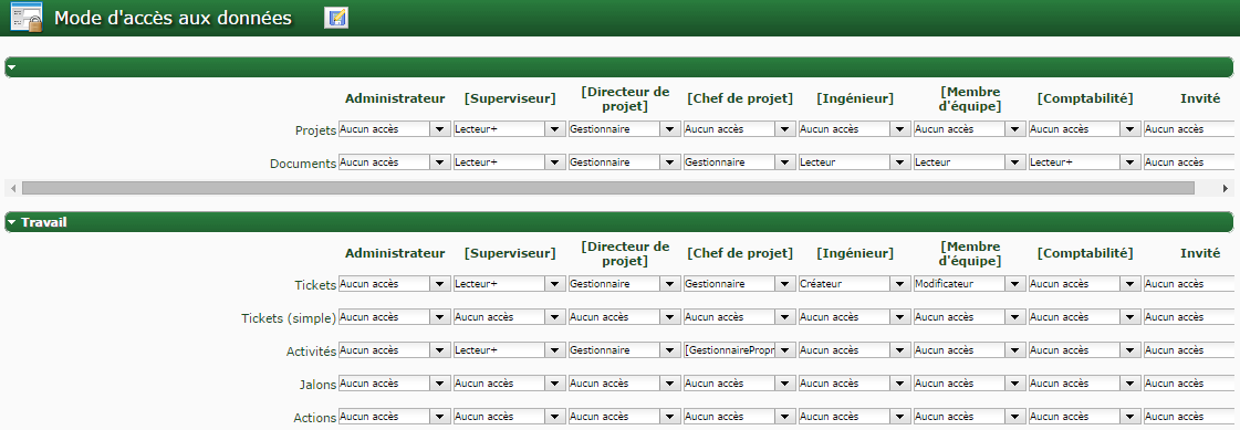 I was not facing this problem when i used the predefined access mode named [Gestionnaire] with this data :