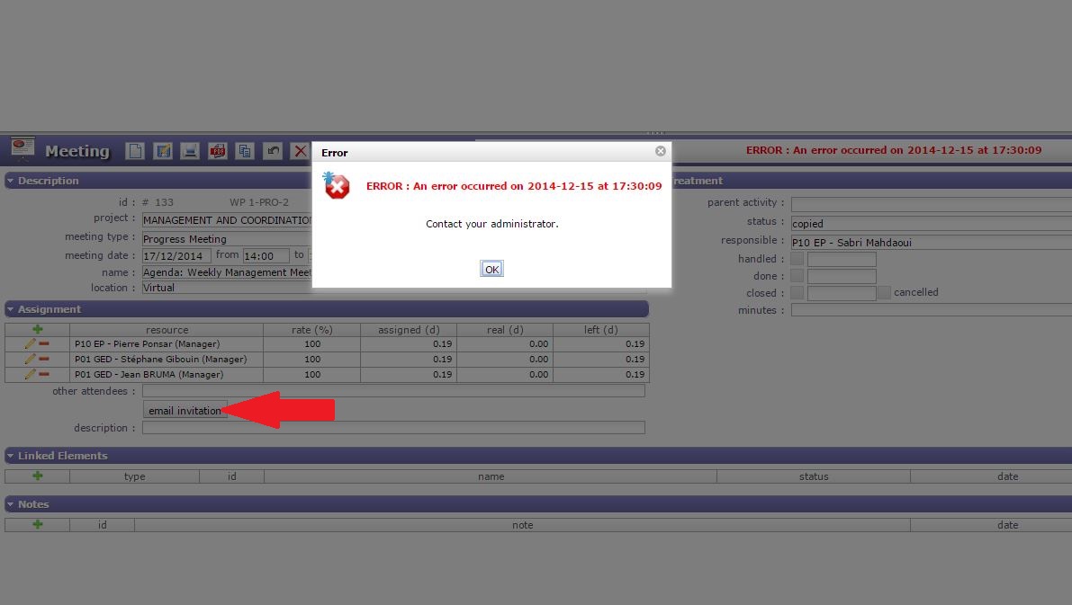I have a problem with sending invitations for meetings on ProjeQtor. As you can see on the attached image, an error message appears when I click on the button "email invitation".