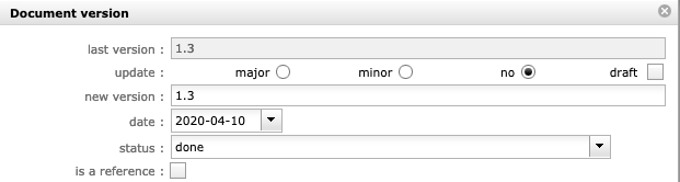 When editing a specific document version, the (disabled) "update" field (at least for "custom" versioning type, did not check others) always defaults to "no", even if another option was selected via the radio buttons when creating the new version.