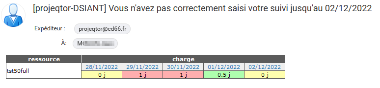In the global parameters the system is set up to send an email to the ressources that did not submit a full timesheet with the option « Oui, contrôlé globalement sur la période