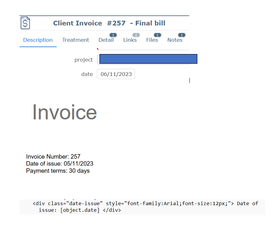 Please check the screenshot with the date we have for the invoice in ProjeQtor (06/11/2023), what we get using the template report we have for client invoices (05/11/2023) and the code on the template file for client invoices.