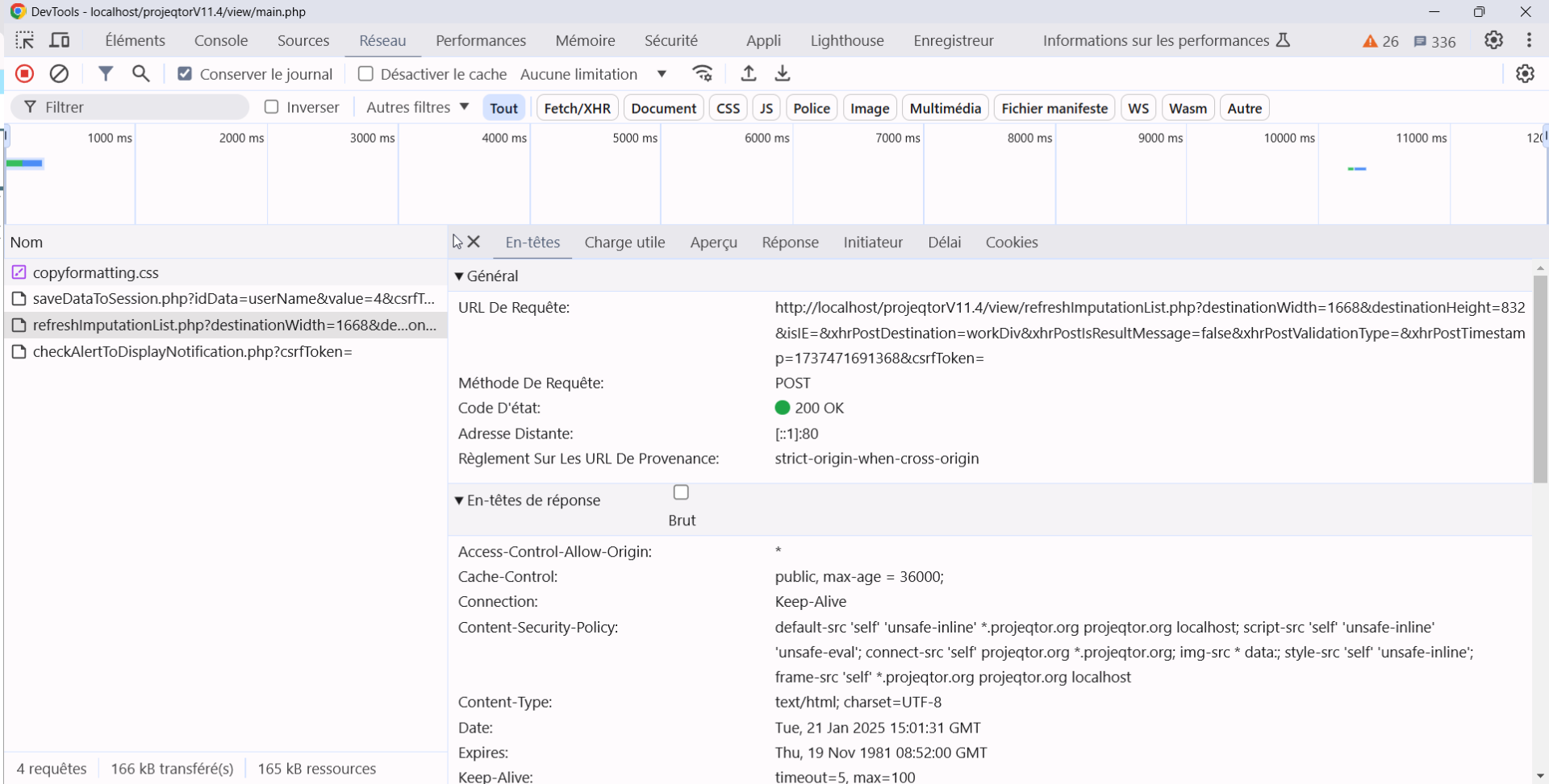 Select line pointing to refreshImputationLine.php, check for headers and response. Possibly you can get some information here.