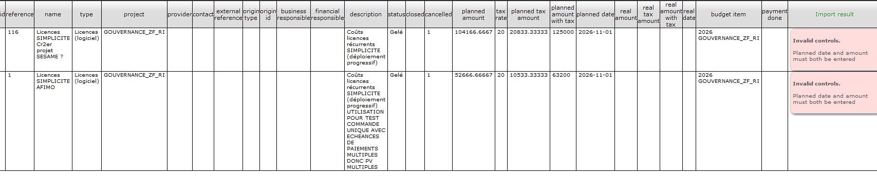 WHY error on planned date and planned amount while the are reading and report on result screen ???? NOTE that value 0 for real amount with tax, appearing in import with id doesn't appear anymore...