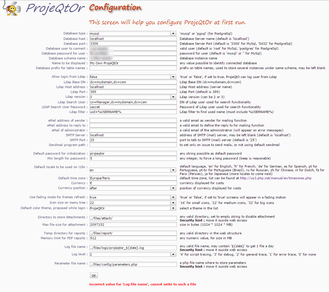 I have read and tried all the replies in this topic, but unfortunately on the ProjeQtOr Configuration screen the message "incorrect value for 'Log file name', cannot write to such a file" still exists.