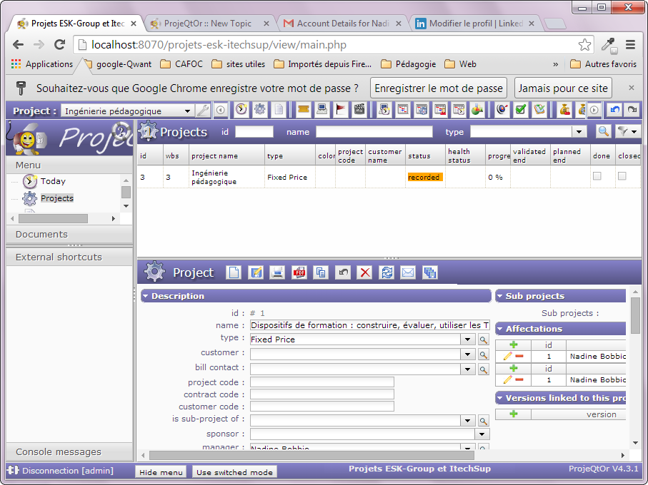 When I enter 4 projects, exactly in the same way, everything goes fine until I disconnect. But when I connect again, the today page is perfect, but only one project is visible on the projects page on the upper part : the number 3. It goes the same with the top area in activities (only the activities for #3 are visible), in planning... On the other hand, on the lower part of the page I can see all projects. weird, isn't it ?