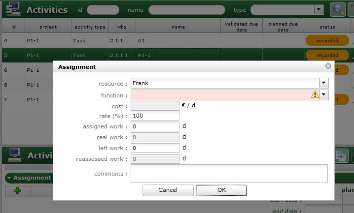 - When creating an assignment on an Activity, and selecting the resource in question, there is no "function" filled in by default , and therefore one needs to be set manually.