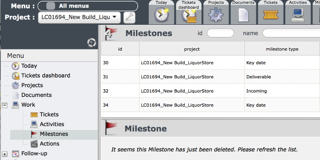 From the Diary view, when I select the milestone it takes me to the Milestone screen but it displays the error which I originally reported.