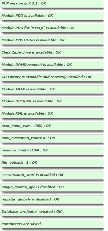 I followed all the prerequisites on the Read Me file, I changed options on the php.ini (wit the extensions needed by the program) and everything was OK (green) when I validated the configuration.