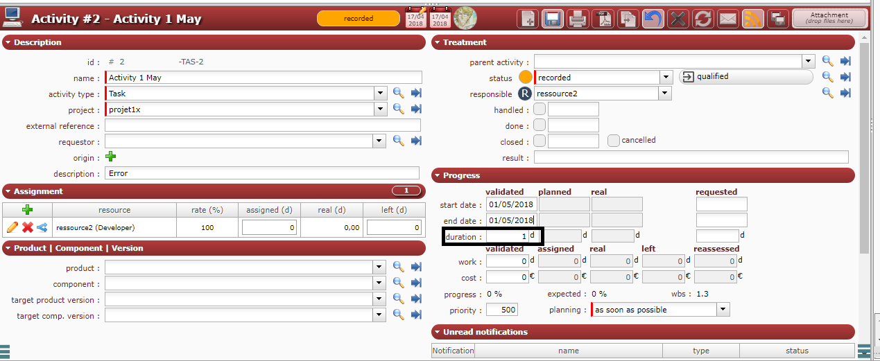 If i create an activity with a start date and an end date set each at 01/05/2018, a date which has been set as an off day beforehand in calendar, the validated duration indicated is 1 day,