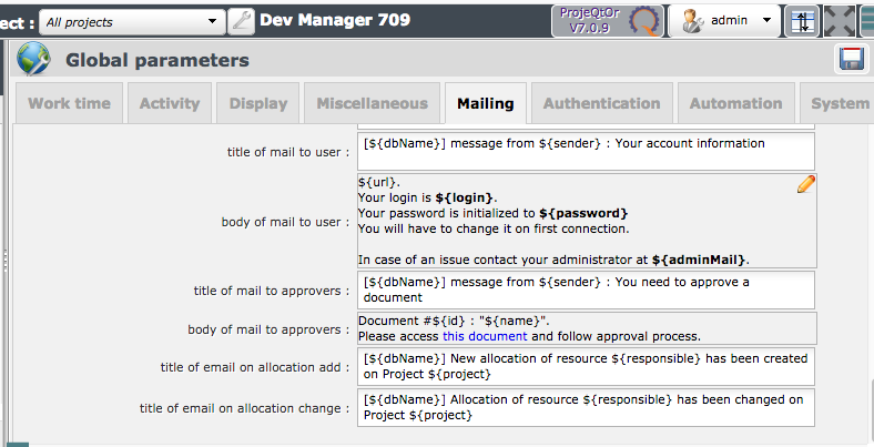In Global Parameters, Mailing section - input field for "message of the email :" , "body of mail to user :" and "body of mail to approves : " are WYSIWYG clickable sections. Once you edit and save, the value in the INPUT form is "undefined.
