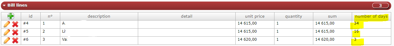 I entered first the 3 bill lines with the amounts and description, then, when linked to the project schedule, I wanted to put the information of the number of work days counted for each line, so I put the number of days for each line.
