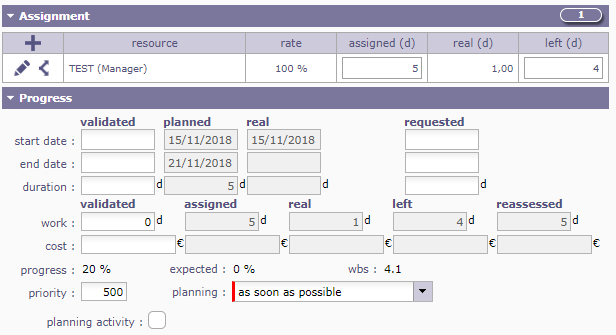 Assigned to activity with 5 assigned days, 1 real day, real cost of activity is 100€