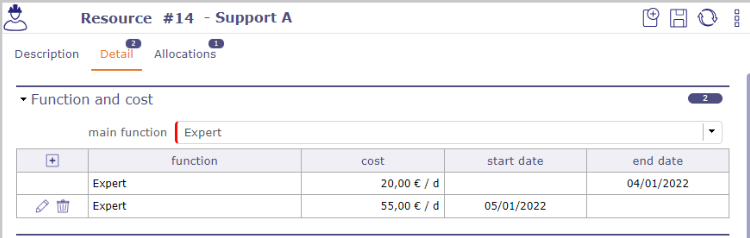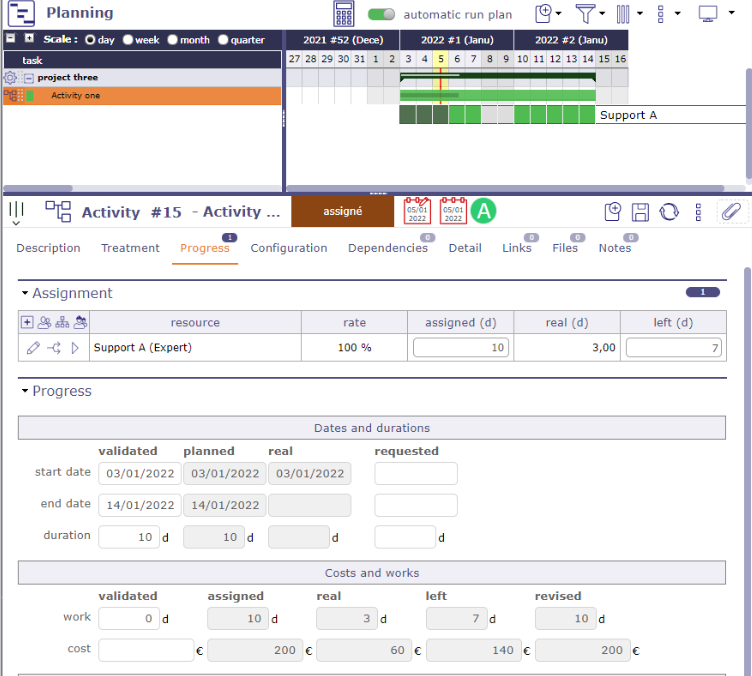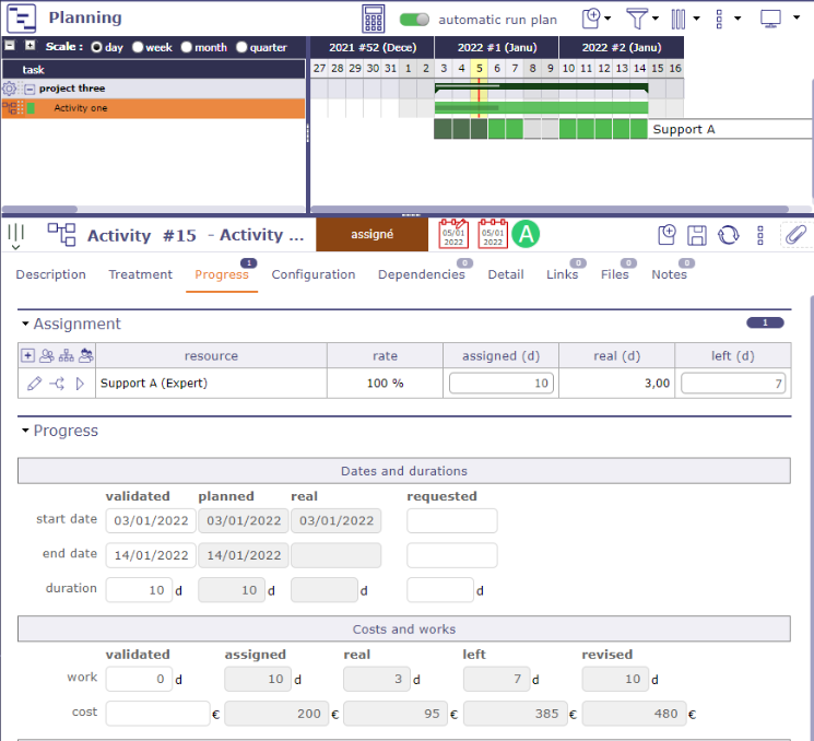 On the first capture you can see the cost calculation on the "support A" resource, estimated at 20 € / d, and planned over 10 days with 3 actual days until the current date.