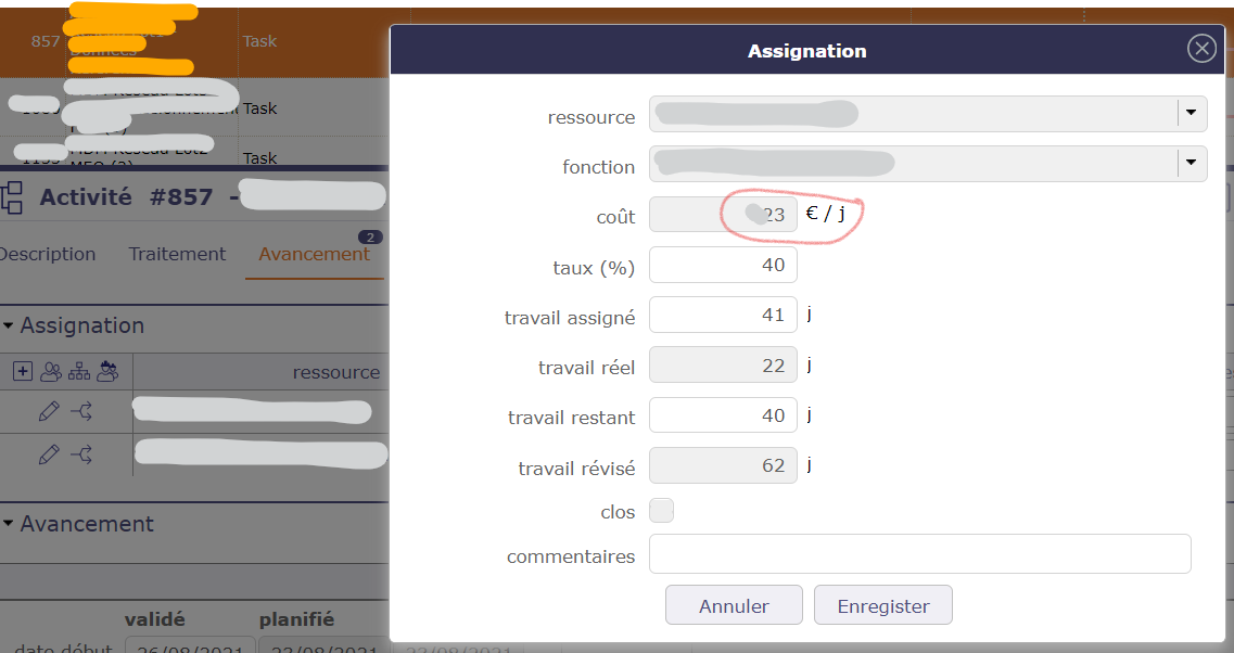 Le coût de ma ressource change aujourd'hui (cf. pièce jointe) mais quand je vais sur son activité, c'est toujours l'ancien coût qui est utilisé pour le calcul du reste et des coûts révisés.