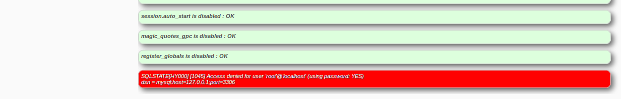 I hjave the exact same issue and message. I installed the EasyPHP current devserver 16.1 stack (you recommended it) and Projeqtor. When I start Projeqtor this is the only error from the config page. I tried using " " as the pass word instead of mysql and there is no change. I'm not a technical db guy so unless you can tell me where to find the password, or what the MySql 5.7 default root password is, your product is unusable. I really need your guidance.