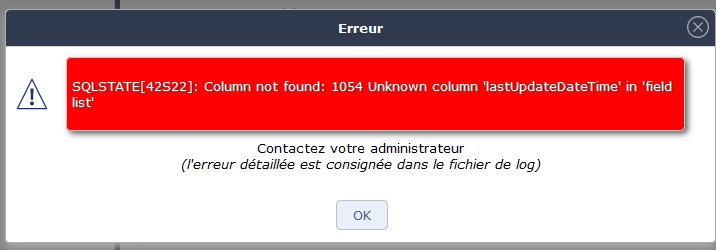 2021-02-01 15:27:25.539 => 0.004 ***** ERROR ***** [V9.0.2] Exception-[42S22] SQLSTATE[42S22]: Column not found: 1054 Unknown column 'lastUpdateDateTime' in 'field list'