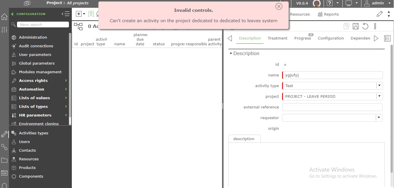 ProjeQtOr free project management software - Activity invalid controls - ProjeQtOr
