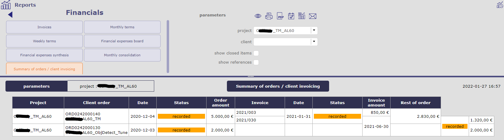 - Project has two orders: ORD0242000140, ORD0242000130, with budget 5000 and 2000 respectively