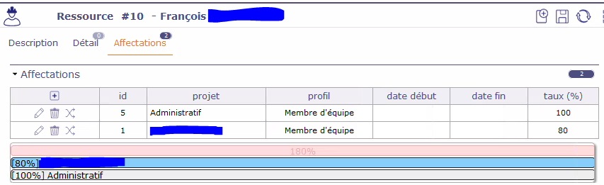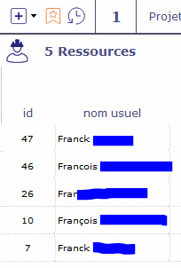 Enclosed : view of resources showing two François (and also two Franck), detailed view of François id 10 showing his assignment to the project, detailed view of François id 46 showing he is not assigned to anyproject.