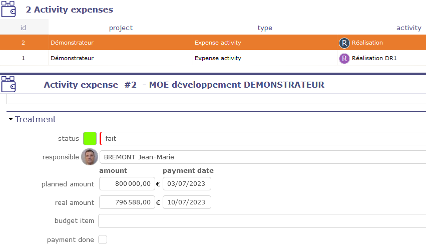 Creating activity expense with 800 000 € planned amount and 796 589 € real amount. Expense is set to "done"
