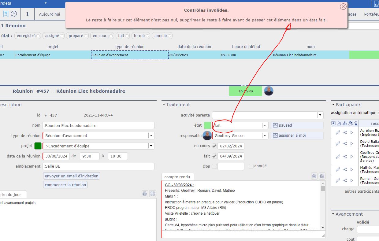 I've got a probleme, I'd change, on time sheet, the left of this meeting, but the left on progress section don't change and, I cannot close this meeting.