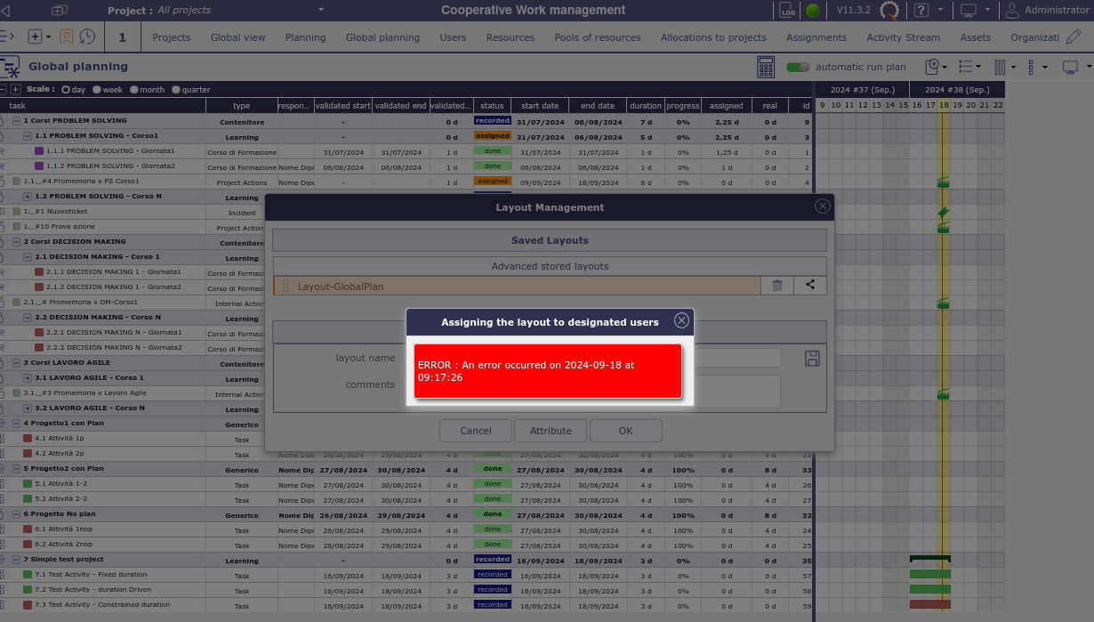 2)  Columns layout modify:  go on "Select columns to display" form for changing number and order of columns -> Manage -> when I click on "Attribute" button after creating the layout (for propagation to all users) I get the following: ERROR on file '/var/www/html/tool/dynamicDialogLayoutForOthers.php' at line (35). Cause = Undefined array key "Planning". Sometimes there is no error (I did not understand why)  but in any case  pressing on OK has no effect on  Global planning layout of other users. This does not happen under all other screens (Planning, Projects, Activities, Meeting, Actions, ...),   when columns layout propagation works by "Select columns to display" form.