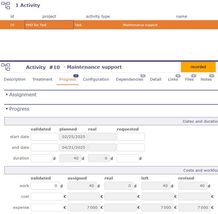 - création of an activity (#10) for 40 days, amount 0€