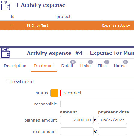 - creation of an activity expense (#4), linked to the activity #10, for 10'000 €