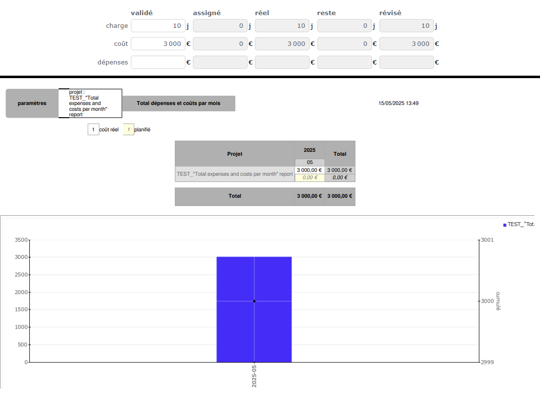 However, when you edit the "Total expenses and costs per month" report, it appears that only the cost of actual days is counted (€3,000), not the cost of assigned hours (which is shown as €0).