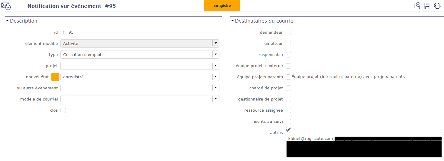 when i try to create a new activity, type "Cessation d'emploi" i enter the details, when i hit SAVE (the first status is "ENREGISTRER" that corresponds to the first state when i hit save" i get a red message at the top