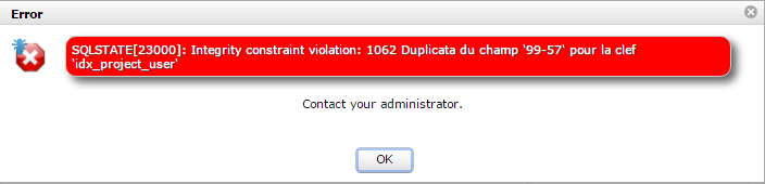 When I am trying to add a new assignment for same resource to my Project to same project I receive attached error message "SQLSTATE[23000]: Integrity constraint violation: 1062 Duplicata du champ '99-57' pour la clef 'idx_project_user'