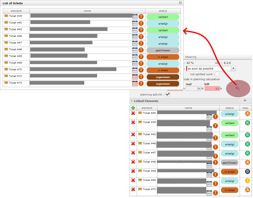 actual the "List of tickets" (reachable via magnifier from activity-details) contains 3 columns (element, name and status).