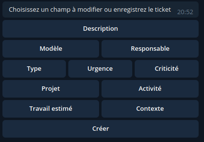 INSERT INTO menu (id, name, idMenu, type, sortOrder, level, idle, menuClass, isAdminMenu, isLeavesSystemMenu) VALUES ( 200000001, 'menuTicketTemplate', 88, 'object', 694, 'Project', 0, 'Automation', 0, 0);INSERT INTO navigation (name, idParent, idMenu, idReport, sortOrder) VALUES ('menuTicketTemplate', 129, 200000001, 0, 51);CREATE TABLE tickettemplate ( id INT(12) UNSIGNED NOT NULL AUTO_INCREMENT, name VARCHAR(100) NOT NULL, idTicketType INT(12) UNSIGNED DEFAULT NULL COMMENT '12', idProject INT(12) UNSIGNED DEFAULT NULL COMMENT '12', idle INT(1) UNSIGNED DEFAULT '0' COMMENT '1', idContext1 INT(12) UNSIGNED DEFAULT NULL, idContext3 INT(12) UNSIGNED DEFAULT NULL, idActivity INT(12) UNSIGNED DEFAULT NULL COMMENT '12', idUrgency INT(12) UNSIGNED DEFAULT NULL COMMENT '12', PRIMARY KEY (id), KEY ticketTicketType (idTicketType), KEY projectProject (idProject), KEY ticketActivity (idActivity), ticketUrgency (idUrgency) );Please Connexion or Create an account to join the conversation.